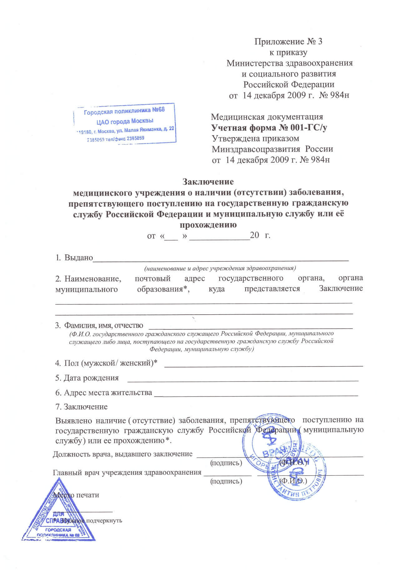 Как выглядит справка на госслужбу формы 001?